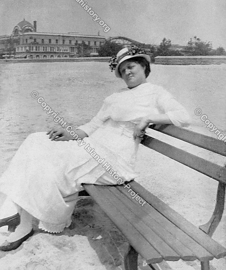 Your great-grandmother is sitting on a bench in the Concourse, the little park beachfront park once located at the intersection of Ocean Parkway and Surf Avenue. The smaller building directly behind her is Lucy Venderveer's Hotel and the dome behind the hotel belongs to the Culver Terminal Building which I believe was built around 1905-1910. The trees in the background are in Seaside Park (now Asser Levy Park). The stone wall in background was part of the park that was demolished when Robert Moses moved the Boardwalk in 1940. Her beautiful hat and dress might date the photo to around 1910-1915?