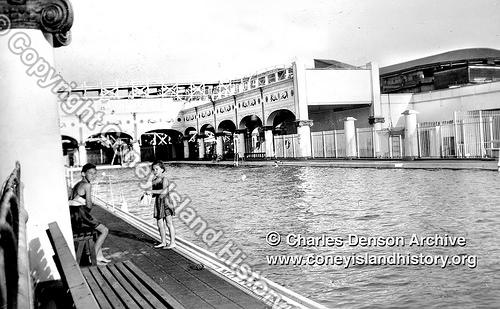 The pool, advertised as the largest in the world, was completed, but the Sea Beach Palace's roof was removed in 1922, turning it into an open-air attraction surrounded by remnants of the ornate columns and balconies that once graced the 1876 buiding.