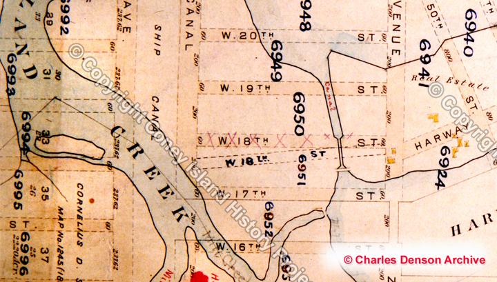 Coney’s mysterious missing streets are a puzzle that’s mystified anyone who’s lived in Coney Island. Why are 18th Street, 26th Street, and 34th Street missing? I’ve researched this over the years and can give my theories. When a new street grid for Gravesend was drawn up in early 1880 the existing roads and streets were plotted southward across the creek and into the West End of Coney Island, which at the time consisted of sand dunes and a few ramshackle hotels along the shoreline. Gravesend’s ancient roads and streets did not follow a true grid in the Manhattan sense, yet the newer streets were plotted as straight blocks running north/south. If an older street that ran at an angle that did not fit the new grid it was eliminated from the West End plan. As you can see from the maps, 18th Street followed an odd angle as it crossed Coney Island Creek so it was eliminated from the map.