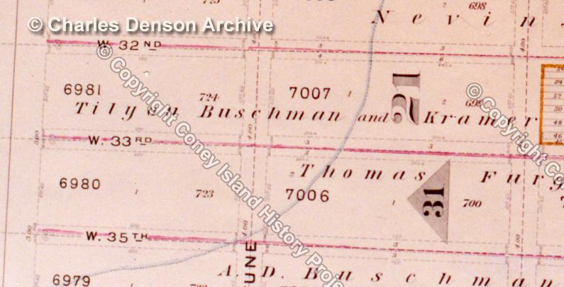 The other missing streets have something in common. They were both early subdivisions made in 1878 when Coney Island’s “common lands” were illegally divided and sold off by John McKane, the felonious supervisor of the Town of Gravesend. The 1878 map shows unusual property lines drawn east of 25th and 33rd streets and these imaginary lines coincide with the first subdivisions of the lands in the West End. The “34th Street” subdivision, from the Ocean to the Bay, was owned by Thomas Furgueson. The “26th Street” plot was owned by Charles Woolsey. Both men were cronies of John McKane. These imaginary lines correspond to the right-of-way for both missing streets and political favors may have something to do with why these two streets were never mapped.