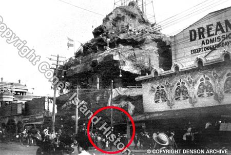 The Dream Studio was destroyed in the 1911 Dreamland fire but reopened shortly after with a new painted backdrop that depicted the burned out ruins of the park. The enclosed photo shows the Dream Studio below the Pike's Peak Railway (circled). The entrance to Dreamland is at right and the Iron Tower is behind Pike's.