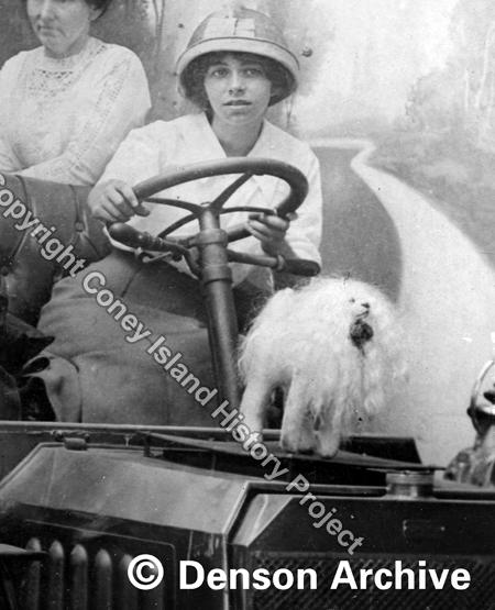 Mr. Tarr operated a souvenir photo postcard business called the Dream Studio on Surf Avenue at West 6th Street below the Pike's Peak Roller Coaster. The studio had numerous full size props including an early automobile and a Wright Brothers style airplane. We have many of his images in our archive and the little white shaggy dog is a constant in these photos. Many of the studios had silly toy props that were used to loosen up the subjects as their photo was taken.