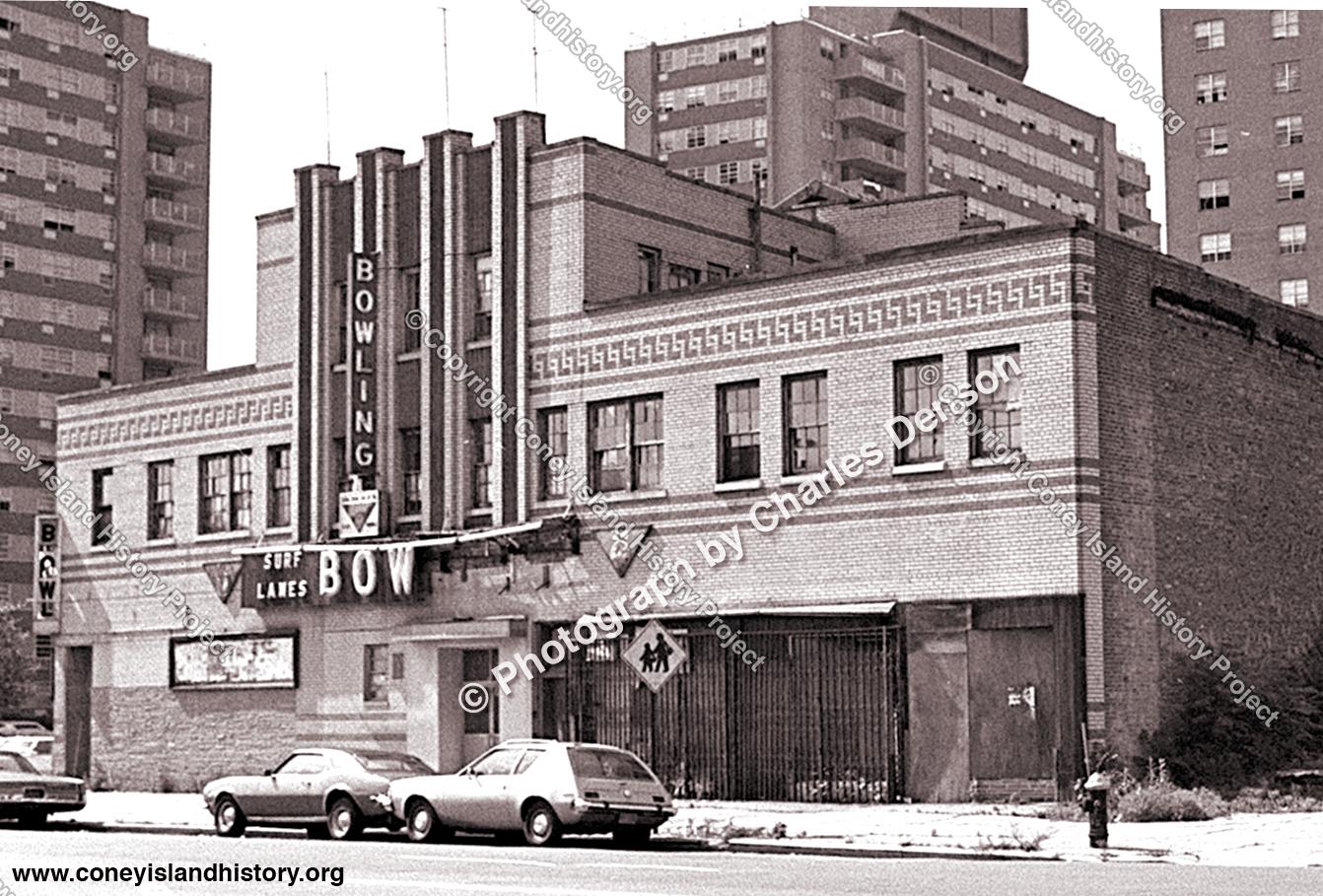 Here's a photo of Surf Lanes on Surf at 32nd Street taken shortly before it was demolished. It was formerly the Surf Theater and I remember it well because it was where I saw my first movie at the age of three. It became a bowling alley around '58 or '59. Also had a great bar! The yellow Art Deco building survived the urban renewal project that brought us the surrounding O'Dwdyer Gardens housing project but was torn down around 1980. The empty lot became an urban vegetable garden, and recently the site of a senior housing development.