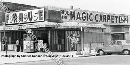 Here's a photo of the Magic Carpet Fun House on the Bowery at West 15th Street. The attraction was run by Edie and Seymour Maxim who also operated the Donkey Game next door. The last version of the robotic laughing lady was actually a German-made laughing male figure in drag. The Coney Island History Project is planning an exhibition of work by the artist who painted the Playland murals. Keep checking our web site for more information.