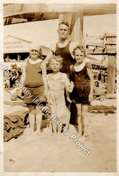 I hope you can help. My mother died recently and in cleaning out the house where she lived i came across a photo album with many pics of the 1920's and 30's of my grandmother and grandfather on my fathers side. There were many pics showing scenes on a beach with what looks like a beach club and some kind of elevated wood structure in the background. This structure does not look like a boardwalk. One pic, which i attached, shows my grandfather with children in front of him and in the upper left a building which i can only make out a partial name ...... *hman Baths and Restaurant. I believe this bath is either Coney Island, or somewhere in Brighton or Manhattan Beach, and if you can identify it, you would help in putting together a little piece of family history for us. Thanks so much in advance!