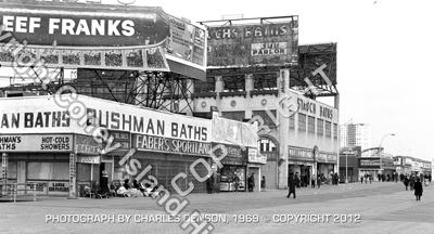The date of this photo is circa 1921-22 and the building in the background is Bushman Baths, located at West 15th and the Boardwalk (which is under construction in the photo, completed in 1923.) Bushman Baths burned in 1973. Note the spelling change in the name (they dropped the "c" somewhere along the way.)