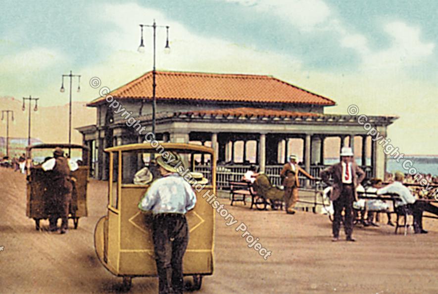 Your memory is correct. The Boardwalk originally had four Mediterranean style pavilions located at West 35th St, West 29th, West 24th, and West 12th Streets.The pavilions at the West End were popular gathering places on summer evenings. Residents of the Hebrew Home for the Aged, located in the old Half Moon Hotel, would sing songs and tell stories in the pavilion at West 29th Street. The pavilions suffered arson fires and were demolished in the 1970s. Here are photographs of the pavilions in the 1920s and shortly before demolition.