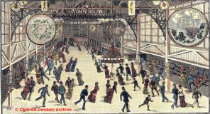 Roller skating has always been popular in Coney Island, dating back to the Sea Beach Palace Roller Rink of the 1890s. The Palace, located on Surf Avenue at West 8th Street, was transformed from a railroad terminal into a rink that hosted roller dancing and roller racing events (see engraving). There were also rinks at Dreamland, Luna Park, and Steeplechase. There are photos of Babe Ruth, dressed like a farmer, whirling around the Steeplechase Pavilion on roller skates.
