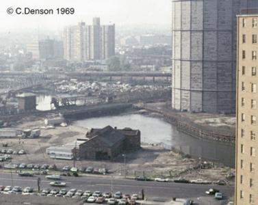 I believe the large gas tank pictured was demolished in Nov. 1981. The loud bang you heard was the inner sub-roof that would move up and down as the gas volume changed inside. The contractor had to post warnings throughout buildings in the area and on lamposts reminding the public of the explosive sound this collapse might produce.