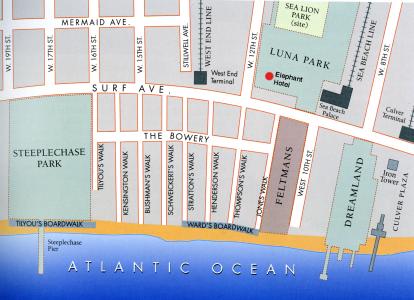 Here's a map from the book, "Coney Island: Lost and Found" that shows the location of the big parks. The Dreamland Tower was located on the site of the Boardwalk ramp to the Aquarium. Dreamland stretched from Surf Avenue to approximately halfway across the present beach; There was no boardwalk when Dreamland was in business.
