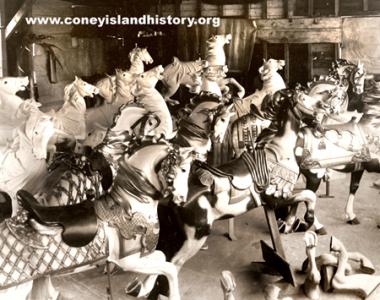 The last Illions carousel factory was located in a wood frame building at 2836 West 8th Street near Surf Avenue, across from the old fire station and up the block from the Mangels factory. The entire block was razed in the late 1950s and is now occupied by the Luna Park Houses housing project.