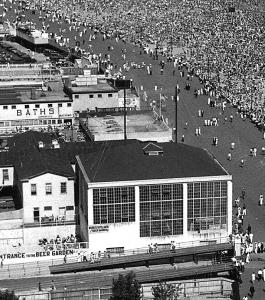 The carousel was part of Weber's Baths on West 27th Street near the Half Moon Hotel. Few people remember that the amusement district stretched that far down the Boardwalk. It was known as the "Chafatino Carousel," carved by Illions, and named after the family that owned it when it was on Surf Avenue at West 5th Street before being moved to Weber's in 1932. It operated inside a beautiful glass pavilion until 1957 when it was relocated to Seaside Heights, New Jersey.