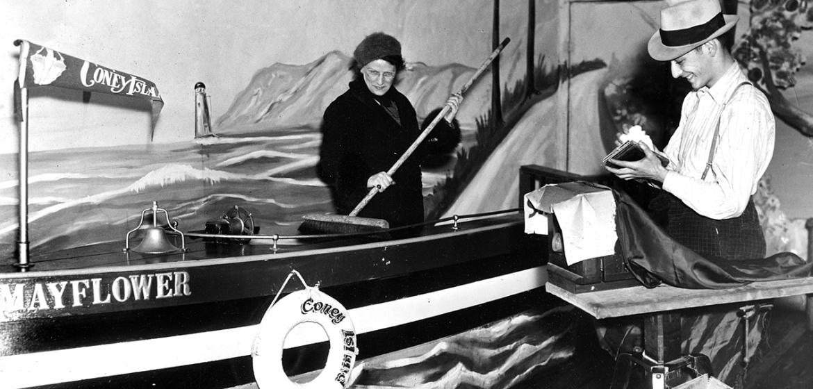 Norman Kaufman, who passed away last November, was born in Coney Island and remained a force there for eighty years. His family operated the famous Mayflower photo studio and souvenir stand on Surf Avenue during the 1930s. "I began working in a darkroom at the age of eleven," Norman said, "developing photos for twenty cents an hour before automatic picture machines were invented." The photo studio's main prop was an old wooden rowboat named the "Mayflower" that enabled generations of immigrants to have their picture taken arriving in America as "Pilgrims."