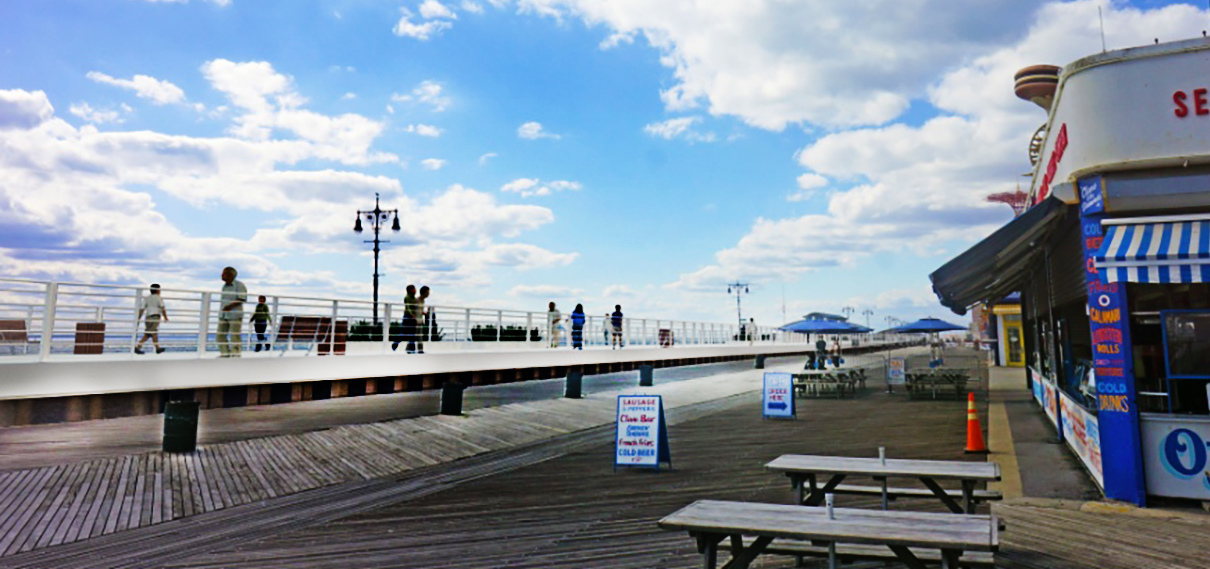 There are two main projects for Coney Island. On the south side of the island, the Boardwalk would be raised five feet by adding what appears to be a wide concrete walkway. This would act as a barrier to prevent flooding from storm surge. The renderings shown at a January 25th meeting were very sketchy. The concrete barrier would block ocean views for Boardwalk businesses as well as taking up about a third of the Boardwalk.