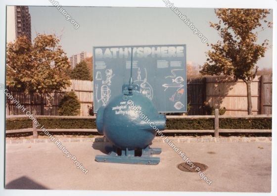 The Bathysphere, originally used for deep-sea dives from 1930-1934, was exhibited at the World's Fair in 1934, and then at the Aquarium from 1957-1994 and 2005-present. Coney Island resident and amatuer documentarian Abe Feinstein took this picture in October 1979.