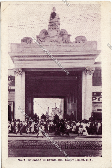 Postcard depicts crowd in front of the secondary entrance to Dreamland park on Surf Avenue west of Creation. Caption on the front of the card reads, "No. 2--Entrance to Dreamland. Coney Island, N.Y.".