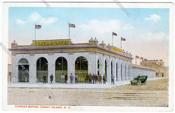 Eureka Baths, Coney Island, N.Y. Eureka Baths from Surf Avenue to Atlantic Ocean at 25th Street. Largest fire-proof bath house on Coney Island. 5,000 Bath Houses.