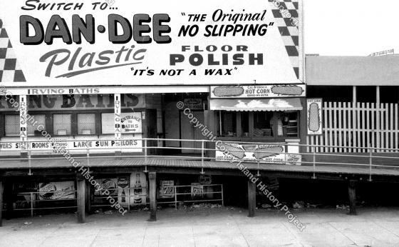 A billboard above the entrance to Irving Baths on West 15th Street at the Boardwalk, circa 1958, Looking west.