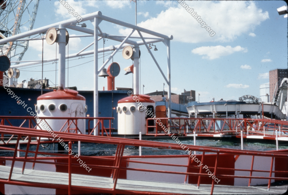 The Neptune Diving Bells was an early addition to the Astroland amusement park. Each of the two diving bells, situated in a 50,000 gallon tank, could carry 15 passengers to a depth of 30 feet where fish and two 500 pound porpoises could be observed. The Luna Park Houses can be seen in the background and the Wonder Wheel can be seen to the left.
