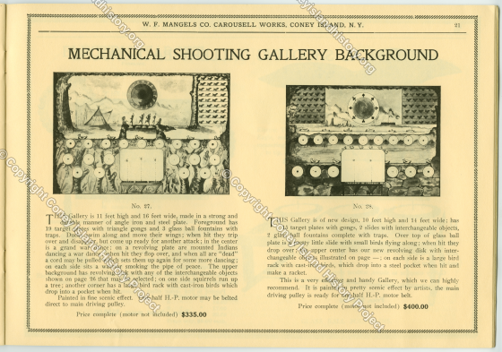 Made with steel plates and iron frames. Describes mechanics of different targets and what happens when they're hit. Targets include steel and iron birds, ducks, Indian war dance, peace pipes, etcetera.
