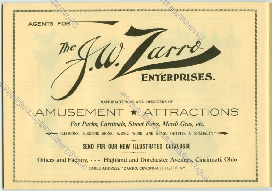 Advertisement for J.W. Zarro Enterprises for illusions, electric signs, scenic work and stage outfits. Can send in for illustrated catalogue.