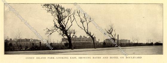 Photograph of Coney Island Park looking East. Baths and Hotel in background.