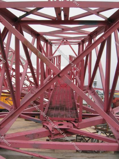 In 2002 the Parachute Jump was disassembled for a thorough structural rehabilitation and repainting. Sections of the Jump were placed in the parking lot of Keyspan Park for sand blasting, painting and member replacement. This photograph is looking down the length of a tower arm, from the outermost section towards the center of the tower. The hole just past the end of the gantry in the foreground routed the cable downward for coupling with the parachute-and-seat assembly.