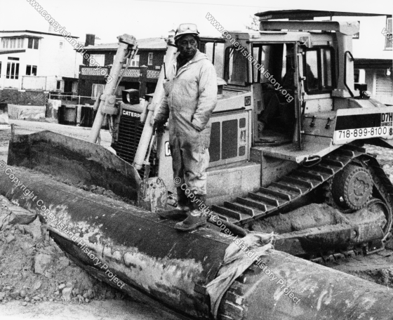Worker laying slurry pipe for beach filling operations on Beach 4 with a bulldozer. In 1995 the Army Corps of Engineers began large scale sand replenishment along the length of the publicly-owned Coney Island beach. The privately owned Sea Gate beach was included because of adverse effects the filling was expected to have on the Sea Gate shoreline.