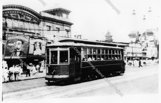 Brooklyn & Queens Transit trolley 2543 on Sea Gate line, traveling west. Luna Park entrance and the B&B Carousell can be seen in the background right. The Boston's Hotel building (built 1907) is behind the trolley. By this time it had ceased to be a hotel and restaurant and was used as a sideshow.