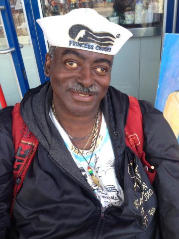 Courtney King was born in Montego Bay, Jamaica, and has lived in Coney Island for the past seven years. An artist since childhood, he began working as a sign painter after training in commercial art and fine art. He spent 12 years working on an oceanliner, where in addition to bartending, he painted murals for the ship's public areas. King also painted and sold T-shirts to both the ship's crew and tourists in ports from the Bahamas to the French Riviera. He currently paints seasonal and holiday windows for businesses throughout the City. In Coney Island, his windows can be seen at Tom's on the Boardwalk and stores on Mermaid Avenue. He can often be found outside Tom's on weekends selling his T-shirts and portraits of celebrities.