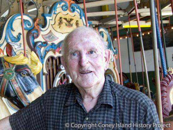 Born in 1920, Max has been in the band organ restoration and maintenance business, which he learned from his father at an early age, all his life. After serving as a paratrooper in World War II, he went back to work with his dad until his death in 1948. Max then took over the business, at which point there were five merry-go-rounds in Coney Island. In the 30's, band organs gave way to "book music" (folding cardboard), then paper (rolls, like those in player pianos) then eventually jukeboxes. Max often gets calls from people whose band organs were improperly fixed. One of his favorite merry-go-rounds was the B&B Carousell in Coney Island. The ride was bought by Messrs. Bishoff and Brienstein in the thirties and sold to Mike Saltzstein and James McCullough in 1973. Max recalls working for Mr. Bishoff, who cared very much about the ride and maintained it well, but he particularly seems to have enjoyed working for Mr. Saltzstein, who died in 2001 at the age of 60. Whenever Max worked on the B&B's band organ, he stayed in a room above the merry-go-round itself. Max is one of a few people who still work on band organs. When parts are required, he makes them himself at his home/studio in Connecticut. In this interview, he gives insights into the carousels of Coney Island and explains the nature of his work.