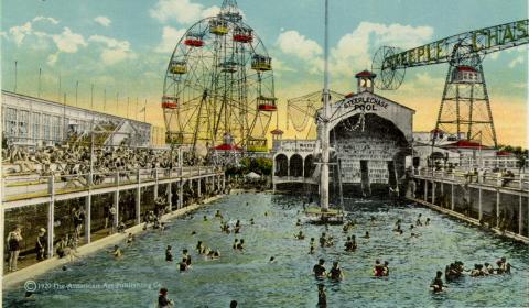 Born in 1926, Nancy Gabriel grew up in Staten Island and visited Coney Island frequently with her parents throughout her childhood. Her great uncle, Peter Lazaris, ran a food concession under the Boardwalk and later at the Steeplechase Pool, from around 1935 to 1953. She recalls going to Uncle Pete's stand, which sold hot dogs, clam chowder, and other Coney Island specialities. He would give Nancy and her cousin a pair of round "Funny Face" combination tickets for all of the rides in Steeplechase Park. She remembers riding the Steeplechase horses and the Chanticleer, a carousel with rooster figures. Later, as an adult, Nancy visited Coney Island with her husband and ate for the first time at Nathan's, where she wasn't allowed to go as a child because her family dined exclusively at Uncle Pete's.