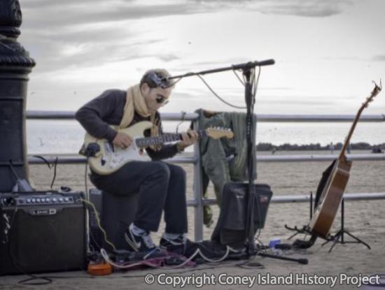 A Coney Island resident for the past 16 years, Paul Sanchez is a singer/songwriter who can be found playing his guitar on the Boardwalk and in Coney venues such as Steeplechase Beer Garden. He plays his signature composition, "A Coney Island Song," in which he sings about "the Playground of the World, where I met my girl." Among Paul's memories are playing at some of Coney Island's beloved venues such as Cha Cha's and Steve's Grill House, which closed their Boardwalk locations at the end of the 2011 season. Cha Cha's was "a rock 'n' roll place... you go in, you take off your safety belt and you just hang on for life," says Paul. He shares memories of Cha Cha's manager, John Thomas, and Steve Bitetzakis of the Grill House, both of whom have passed away, and of some of the colorful characters he has jammed with on the Boardwalk.