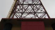In 2002 the Parachute Jump was disassembled for a thorough structural rehabilitation and repainting. Sections of the Jump were placed in the parking lot of Keyspan Park for sand blasting, painting and member replacement. This photograph is of tower...
